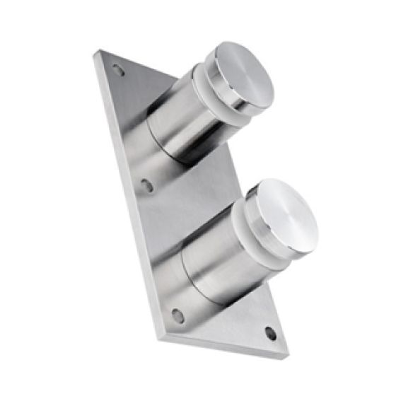 1-3/4" length - 2" diameter, round, fascia mount double standoff, suits 12mm (1/2") to 19mm (3/4") glass in alloy 316 stainless steel, #4 satin finish.