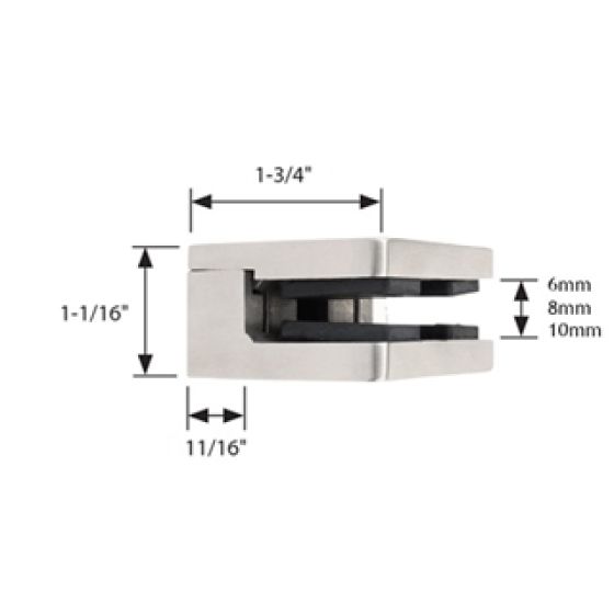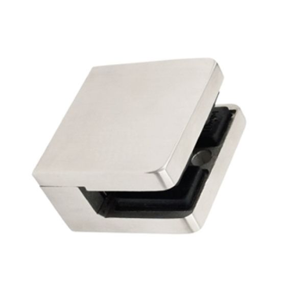Small, round, glass clip for square tubing, suits 6mm (1/4") to 10mm (3/8") glass in zinc, satin nickel finish.